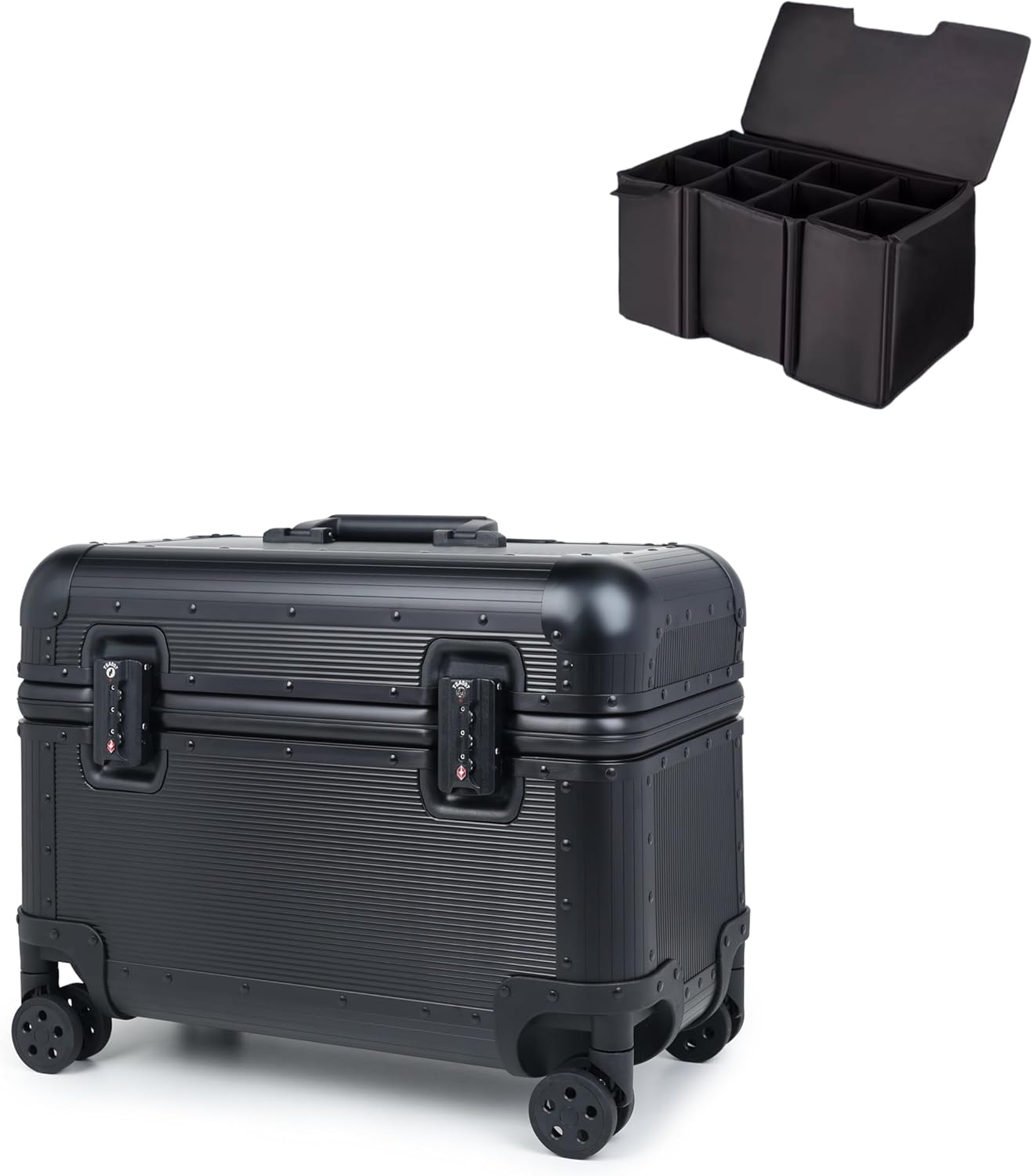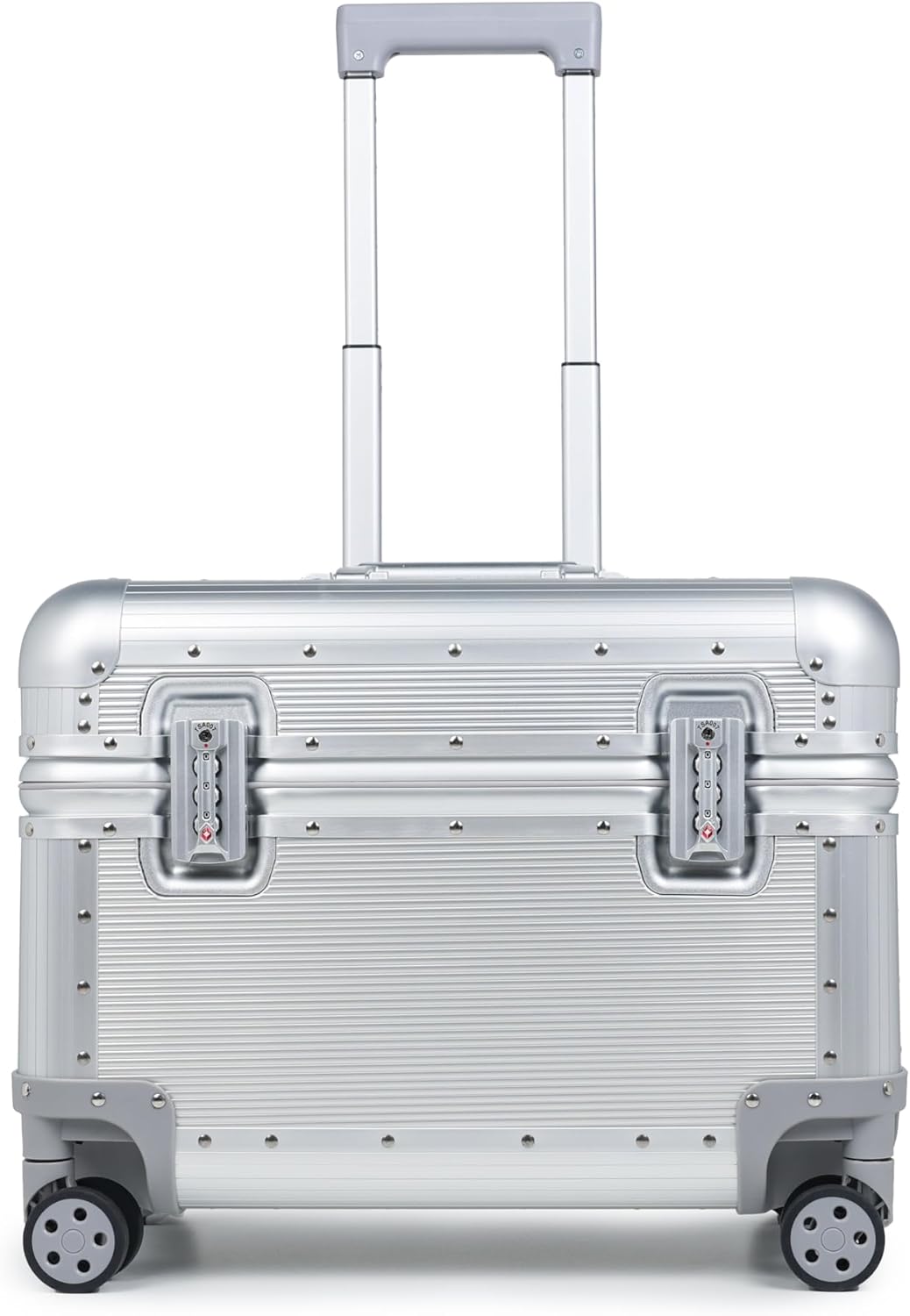 This premium aluminum rolling camera case combines durability with mobility, perfect for protecting valuable photography equipment during transport. The sleek silver hard-shell exterior features a distinctive ribbed design and robust construction with reinforced corners. The case includes a practical telescopic handle system and smooth-rolling wheels for effortless navigation through airports or studios. Secured with heavy-duty latches, this professional-grade equipment case offers superior protection against impacts and environmental elements. The thoughtfully designed interior can be customized to safely house cameras, lenses, and other delicate photography gear. Its airline-compatible size and sturdy wheels make it ideal for both local shoots and long-distance travel. The combination of industrial-grade aluminum construction and practical mobility features makes this case an essential tool for photographers who need reliable protection for their valuable equipment while maintaining ease of transport.