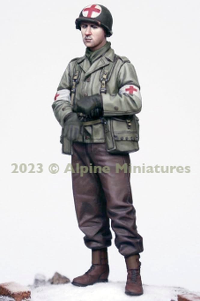 Alpine Miniature 1/35 US Sanitary Soldier Resin Kit Resin figure reproduces the U.S. Army Sanitary Soldiers of War II. She wears a M1 helmet and wears a M1941 field jacket and has a red cross armband on both arms. In addition to the vibrant, natural posing of pulling the right hand, the figure also features accessories such as suspenders and multiple water bottles. Comes with 2 types of heads. Made of resin. *This product is unassembled. This product is a resin kit that requires assembly and painting. Adhesives, tools, paints, etc., are required for assembly and painting. This product does not include any adhesives, paint, tools, or batteries.