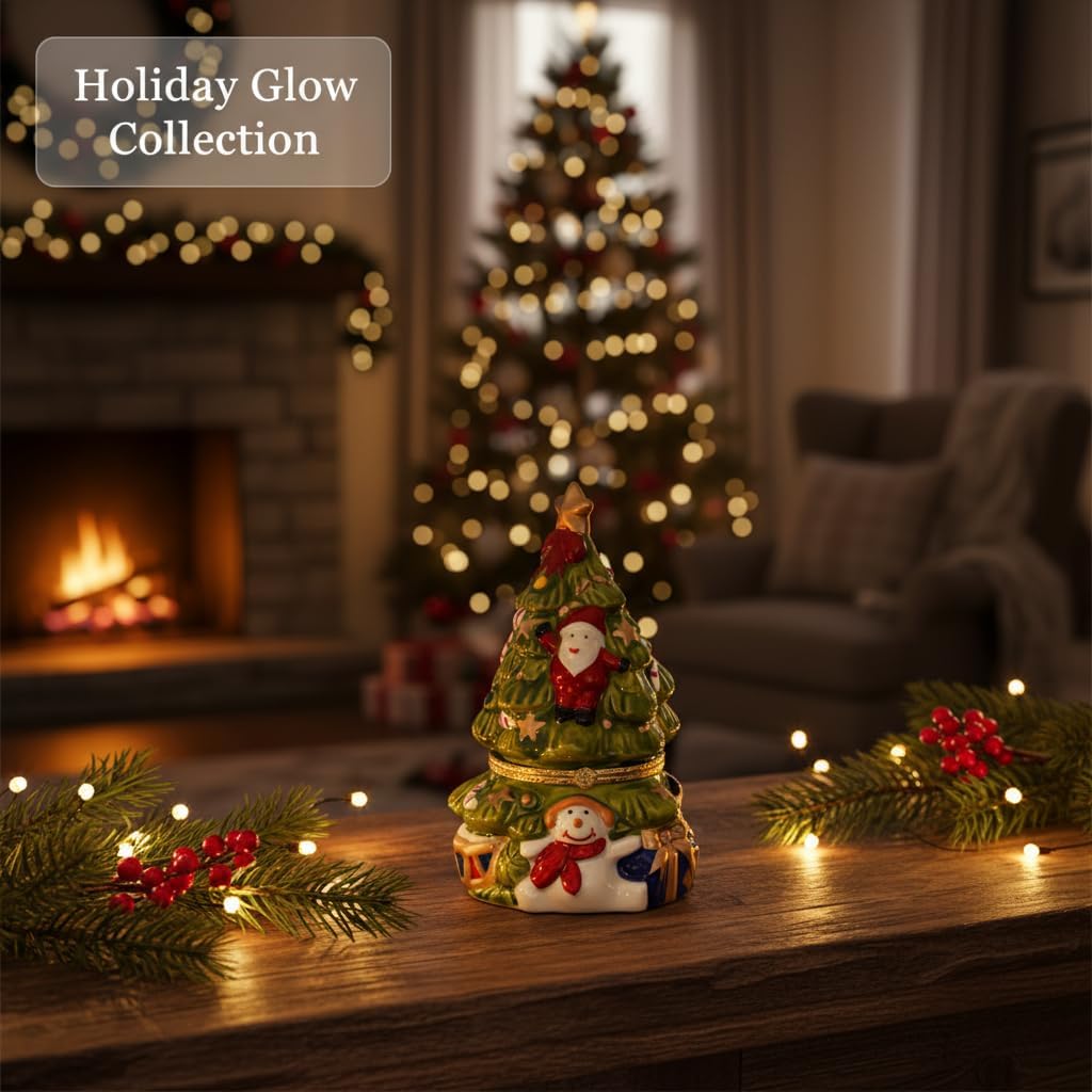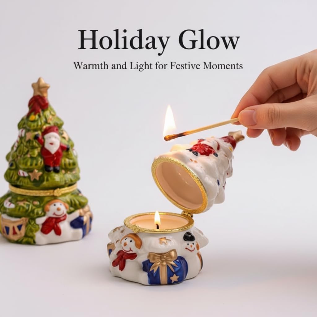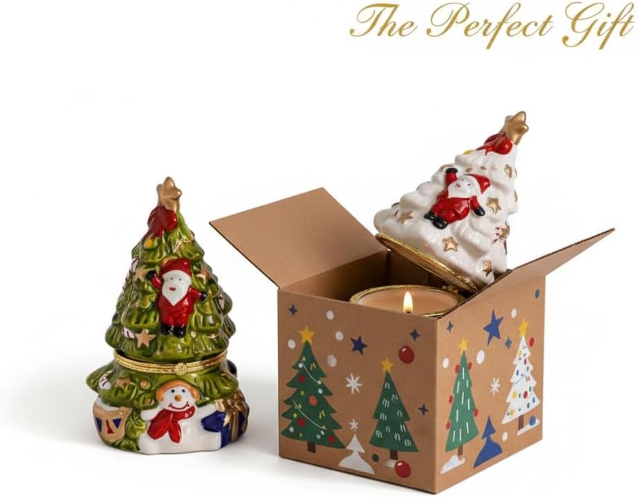 Bring the magic of the holidays into your home with our Ceramic Christmas Tree Candle Jar This beautifully crafted piece features a classic evergreen tree shape, intricately detailed with 3D figures of Santa Claus and a cheerful Snowman. Designed to hold standard tea lights or small scented candles, it casts a warm, inviting glow that instantly makes any space feel cozy and full of joy. High-Quality Construction: Made from durable porcelain, the jar is finished with a vibrant glaze that sparkles under the light. The lid is connected by a vintage-style gold metal hinge, allowing it to open smoothly to reveal the candle compartment inside. Beyond Lighting: When not used for candles, this versatile piece acts as a charming holiday trinket box. Store your rings, earrings, or small treasures inside while adding a festive touch to your nightstand or coffee table. Whether as a centerpiece for your Christmas dinner or a unique gift for a loved one, this ceramic tree is a timeless addition to your holiday collection