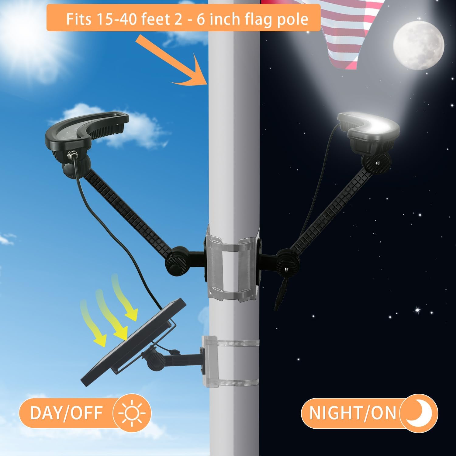 • 【12000mAh Solar Flagpole Light】 - UP TO 15 Hrs! It is truly a "set it and forget it" product. 12 high-brightness lamp beads, Built-in 12000mAh battery with 12W large solar panel, more better than 95% of similar products in the market, easily to illuminate the Flag at night.