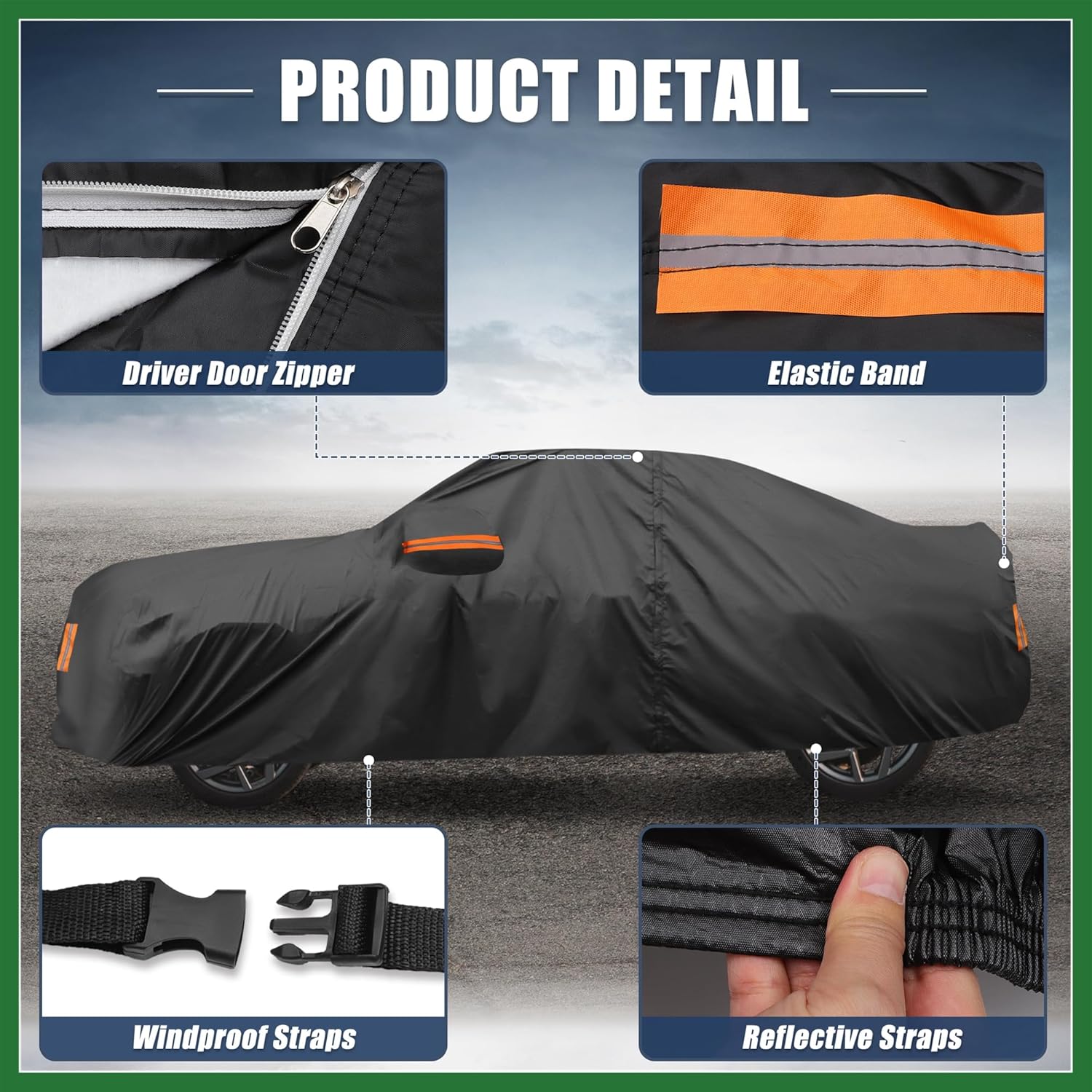 Feature:We are focusing on the development of specific models to make them fitter and more professional car covers instead of universal car covers.The cover is breathable and allows heat, moisture, and condensation to escape.The single middle layer acts as a filter against basic everyday dust.Fully protects from any types of elements such as tree sap, dust, snow, leaves, rain, etc.It is a good replacement for the old or broken one, a match for the original.Please allow 3-5cm differences due to manual measurement.Installation: Easy Drape On InstallationThis is a non-OEM product, accessory only!Specification:Color: BlackMaterial: Aluminum Film, Inner CottonDimension: 490x192x128cm/ 193"x76"x50"(L*W*H)Fitment:for Ford for Mustang GT/Bullitt/ECOBOOST 1994-2021Package Include:1 Pcs Car Cover1 Pcs Storage Bag