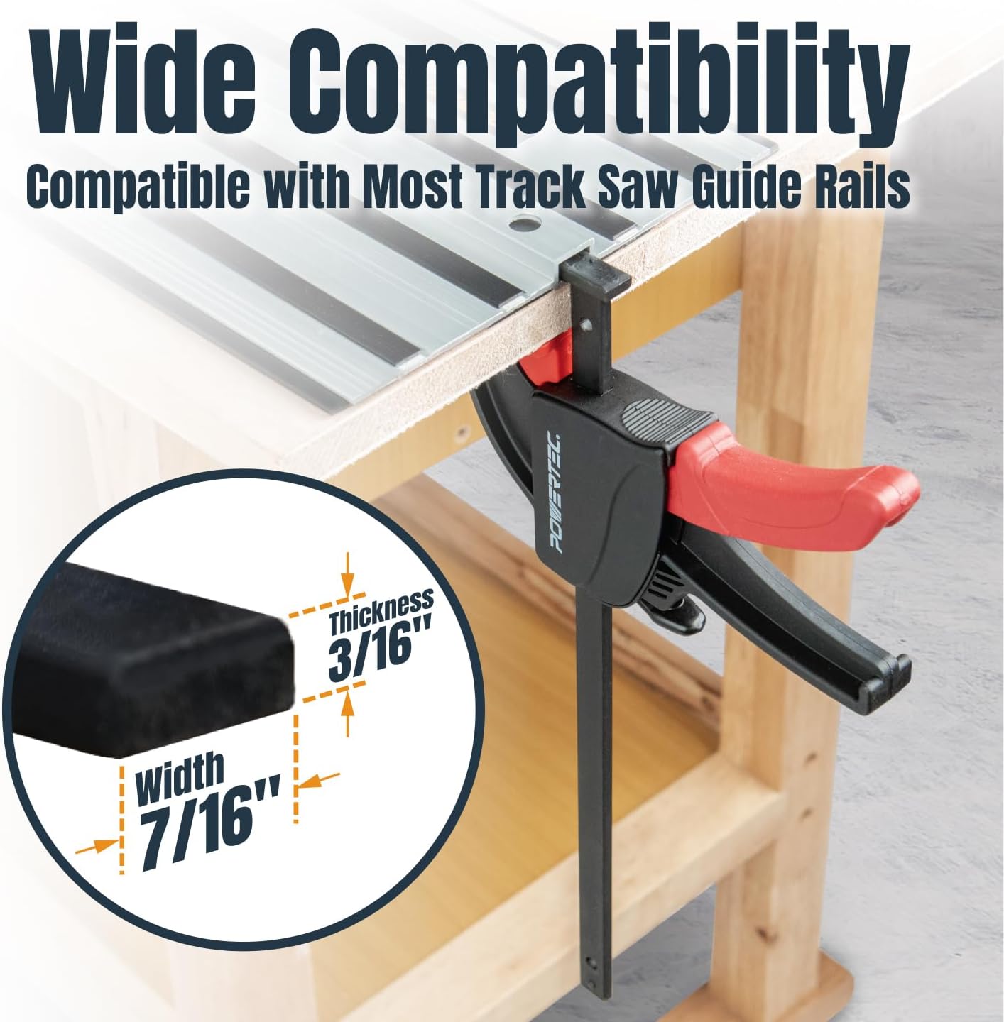 Introducing the Track Saw Guide Rail Kit with Connectors and Carrying Bag by POWERTEC. This kit was put together to provide you with a high quality set of 55 inch tracksaw tracks (guide rails), along with their connectors. Designed with high quality control in mind, the included components help you pair/ join the two tracks together, lining up square for accurate straight cuts. Our easy-to-use set interacts with the saw base to deliver high precision and balanced results. No matter whether you’re ripping sheet material or cross-cutting, you’ll find these tracks easy to set up and extremely versatile for your track saw projects. They are compatible with Festool, Makita and many other popular tracksaw brands. Each track is constructed of professional grade extruded aluminum. They possess a replaceable rubber splinter guard designed to minimize clean-up, while controlling flying sawdust during operation. This set includes (2) guide rail connectors – each one requiring four set screws for maximum track stability. PLUS… a Guide Rail Carrying Bag The 60 x 9 inch guide rail bag offers you a safe and maximum protection solution to securing your guide rails, tracks, clamps, connectors and other components. The heavy duty exterior is constructed out of non-tear, water resistant and moisture proof material designed for any set of workshop or environmental conditions. In inside flaunts dual-sided padded protection for a dual set of rails, along with individual straps to hold and secure your components. Features: Reinforced Zipper Closure Heavy Duty Shoulder Strap Ergonomic Handle Large 18”x 8”Pocket for Extra Storage Compatible with: Makita,Festool,WEN,Triton... Introducing the (2 pack) Tracksaw Track Clamps by POWERTEC. These clamps are designed for use with your saw guides and cutting systems. For optimal convenience, they flaunt a universal design that makes them highly versatile for an assortment of woodworking applications. Whether utilized in the channel of a 55” guide rail to clamp it to a workbench, or in the top channel of the guide rail, working as a stop – these clamps are easy to use and help deliver exceptional results. Premium DesignOur clamps are made with a rugged, heavy duty construction designed for long-term durability. The clamps are ideal for single-handed operation. They come equipped with squeeze grip triggers for a quick set up and to ensure maximum workpiece security operating. They’ve been highly ranked and successfully tested for quality control, not only for POWERTEC track saw guides, but suited for these other major brands as well. and others (check the dimensions of your unit) Clamp Specifications· Max Opening with Pad: 8-5/8 inch· Throat: 2-1/2 inch· Groove Bar: 3-1/4” Long x Nominal 7/16 inches wide x Nominal 13/64” thick· Overall: 7-3/8” x 2-1/2” x 1-1/4 inches· Color(s): Black and Red