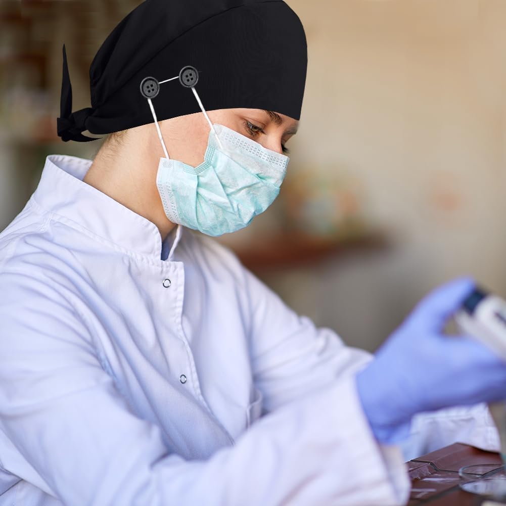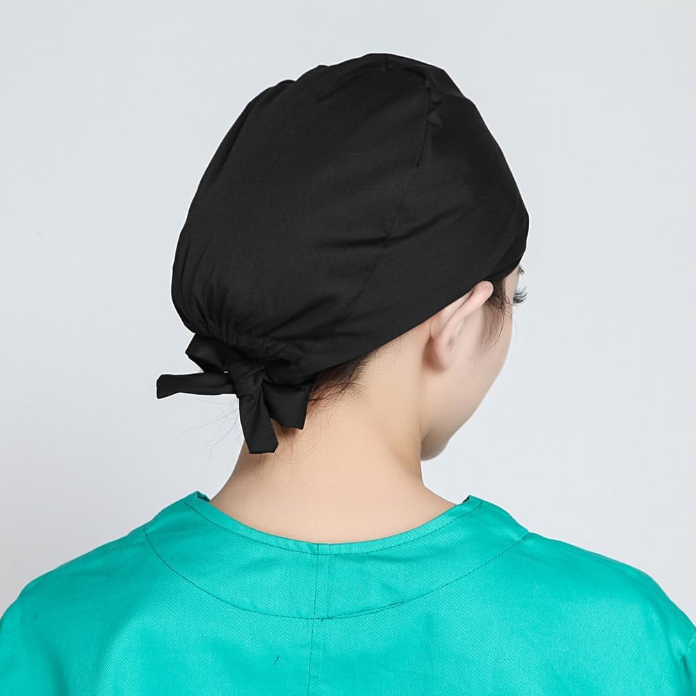Specification: -Material: cotton polyester & satin -Size: one size fits most women Features: Built in sweatband: The built in sweatband of the surgical cap can quickly absorb sweat, preventing sweat from dripping into eyes and keeping the forehead dry and cool for a long time, even work in hot summer. Working cap with buttons: The buttons of the working caps are properly positioned, which fits the distance between buttons and face. So the strap can be hung from the button instead of the ear, to avoid the pain, pressure and burden on the ears. Package Includes: 2 x satin lined scrub caps