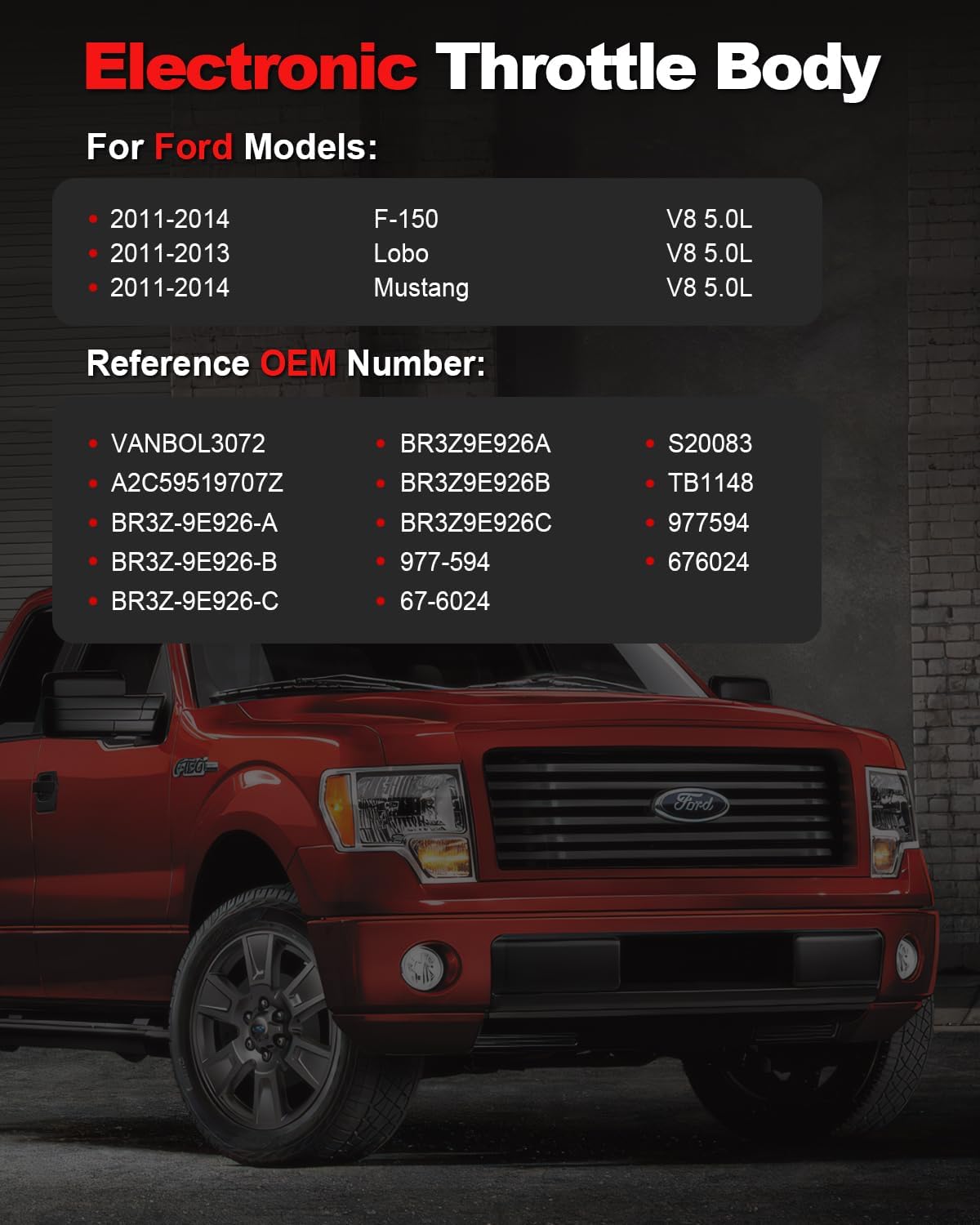 | Model | For 2011-2014 Ford F150 Lobo Mustang 5.0L V8 GAS FLEX FX4 King Ranch Lariat Platinum STX XL XLT Boss 302 GT FX2 |