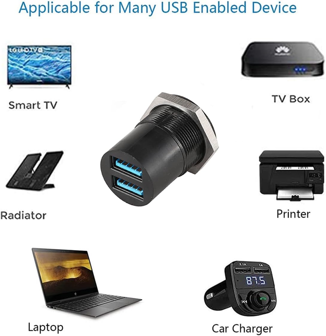 Technical Specifications: Connection Type: USB3.0 Rated current: 0.5A Rated voltage: 50V Insulation resistance: >500MΩ Dielectric strength: DC1000V Contact resistance: <10mΩ Material: Shell: Zinc diecast Contact material: Bronze Insulator material: PBTP 15% GR Environmental conditions: Working temperature: -40~120Celsius Storage temperature: -25~85Celsius Atmospheric pressure: 86~106kPa Relative humidity: ≤90% RH Installation panel thickness: min 2.0mm-max 10mm Base shape: Round type Package includes: 5 xDual Port USB3.0 Connector