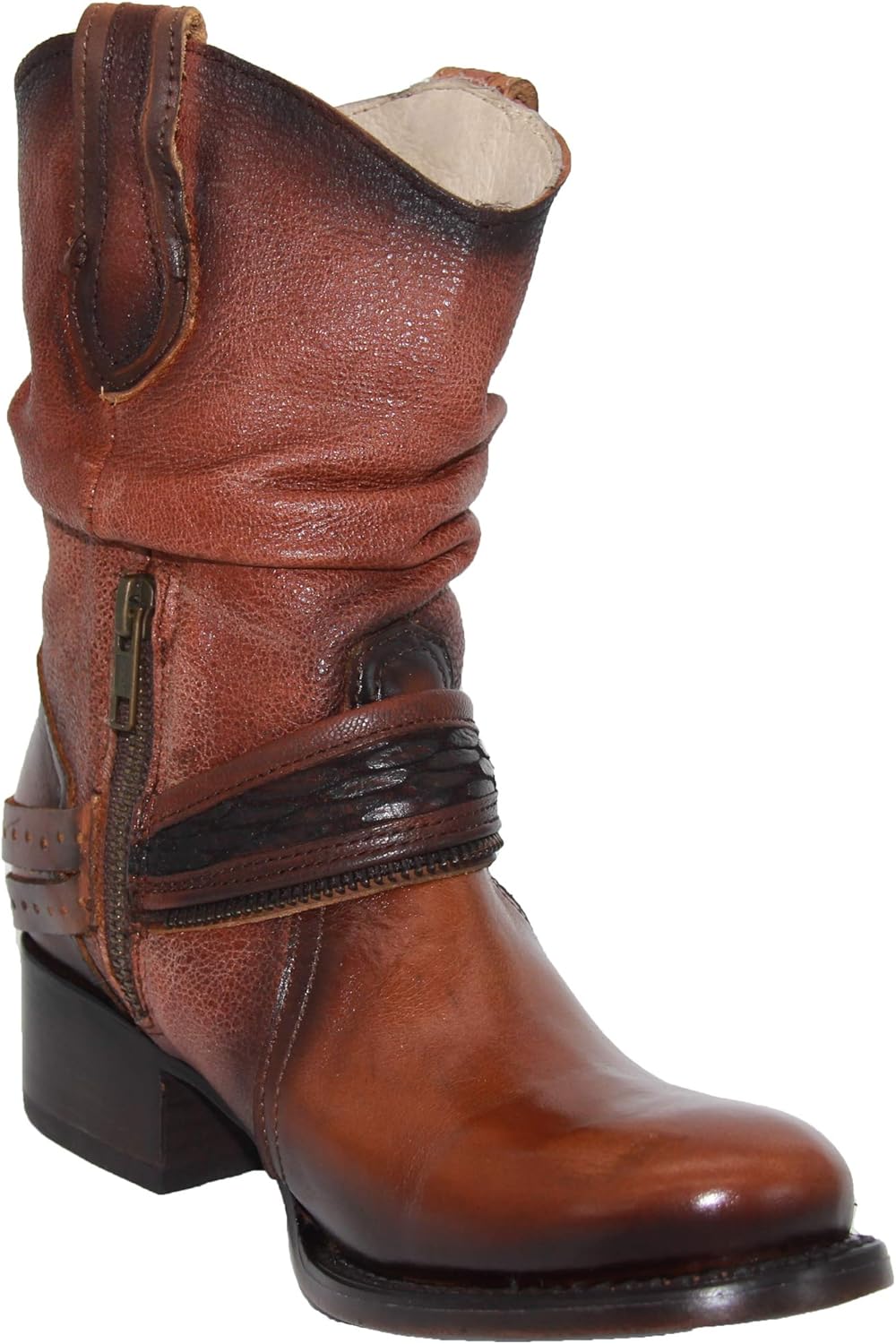This fashionable women’s genuine leather western boot is beautiful, feminine and a statement piece. Features a round almond toe profile, leather sole, leather insole and all leather inner lining. Heel measures a comfortable 1 ½ Inches along with a shaft which measures approximately 5 Inches from arch. The Dual pull on straps make it easy to slip on and off. This boot has a lot of detail to offer including a decorative side zipper along with a decorative harness strap adding a beautiful touch to the boot. The rich two toned leather adds elegance to the vintage look of the boot. Made in Mexico with premium leather great style and craftsmanship. This boot does fit snug, please consider ordering a half size up.